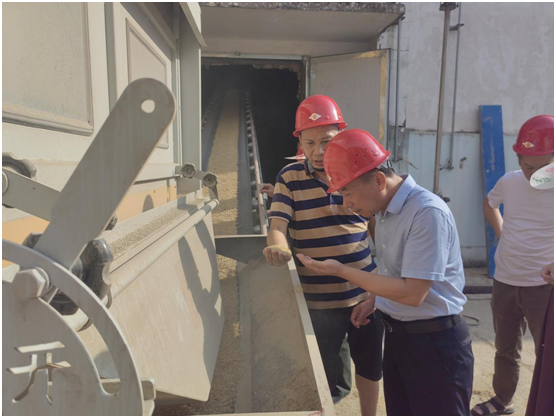 隨后,按照夏糧收購(gòu)流程,雨民董事長(zhǎng)全程考察了現(xiàn)場(chǎng)各個(gè)作業(yè)環(huán)節(jié),并聽取了三塘公司今年政府儲(chǔ)備糧輪換收購(gòu)的情況匯報(bào)。在卸糧口,雨民董事長(zhǎng)抓取輸送機(jī)上稻谷查看今年收購(gòu)入庫(kù)稻谷質(zhì)量,再三強(qiáng)調(diào)必須把好新糧入庫(kù)質(zhì)量關(guān),并叮囑現(xiàn)場(chǎng)作業(yè)人員一定要規(guī)范作業(yè),確保人員安全。
